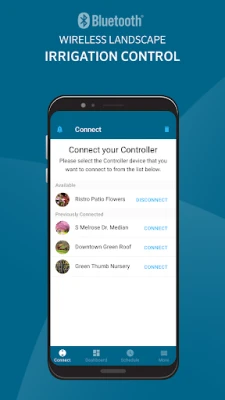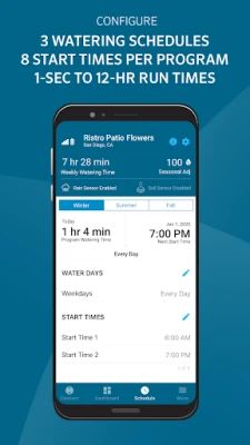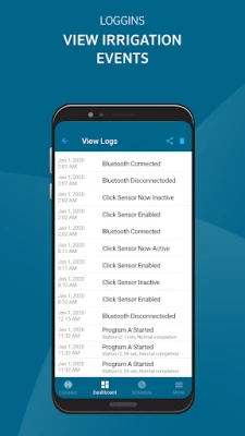 • See controller status, total watering and next start times, watering calendar, and irrigation logs