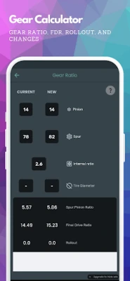 Easily calculate your gear ratio, final drive ratio, or rollout. Enter your gears "before and after" to see the real impact of your gear and tire changes as a percentage (e.g. +2.5%), so you'll know exactly how much speed and motor load to expect.