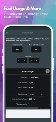 For nitro racers, this calculator shows you how much fuel your car uses per minute in racing conditions, and it shows how much fuel you'll need to finish long races, and how many pit stops you'll need.