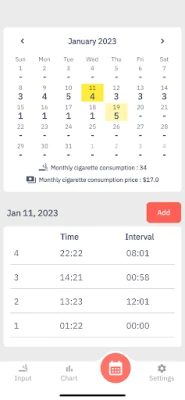 In addition, the Chart screen allows you to check the number of cigarettes smoked per week, month, and year, as well as the amount of money spent.
