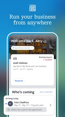 The Vrbo Owner Mobile App makes it easy to manage your vacation rental. Stay connected with travelers, manage your bookings, and run your business, anytime and anywhere.